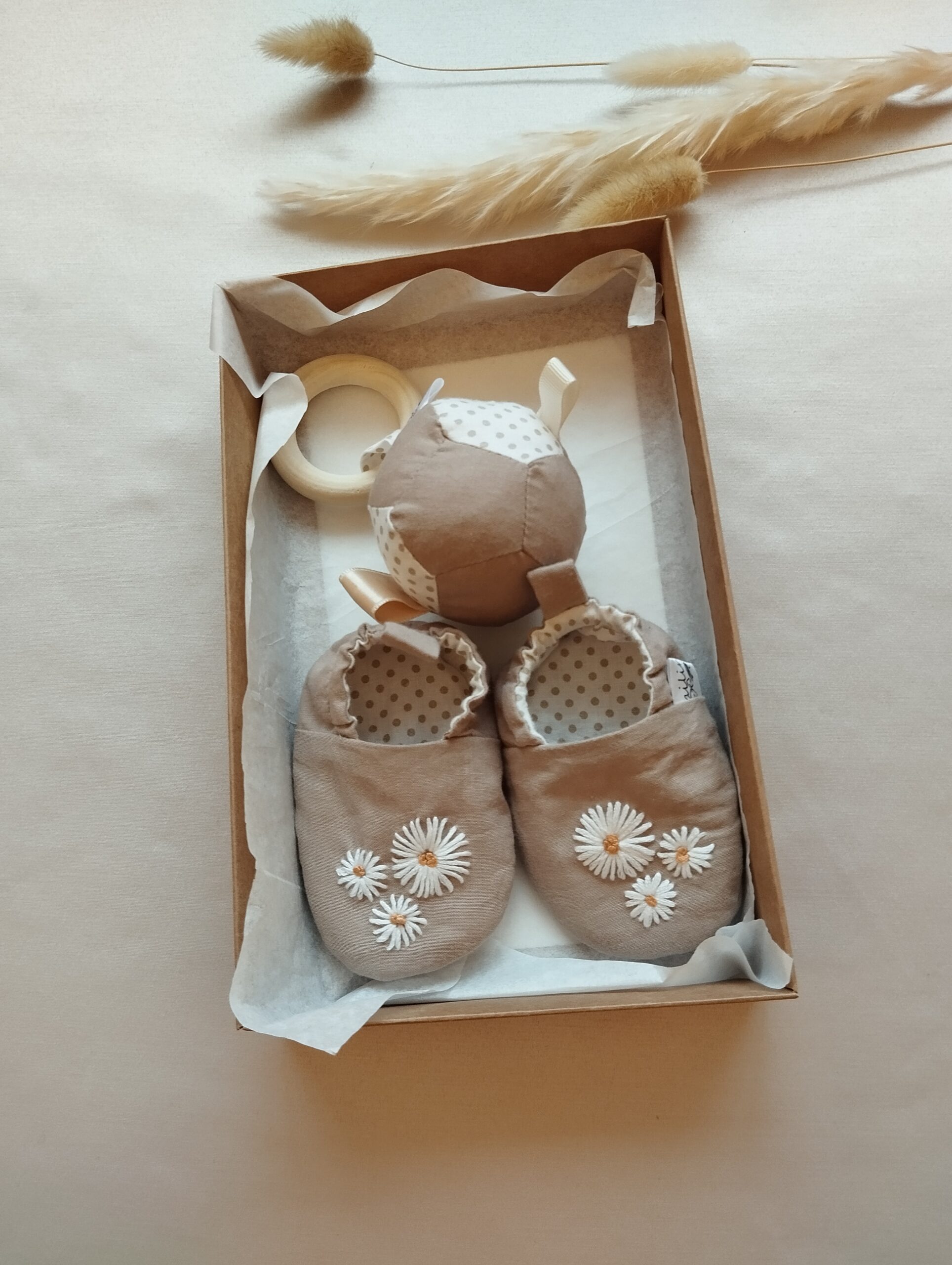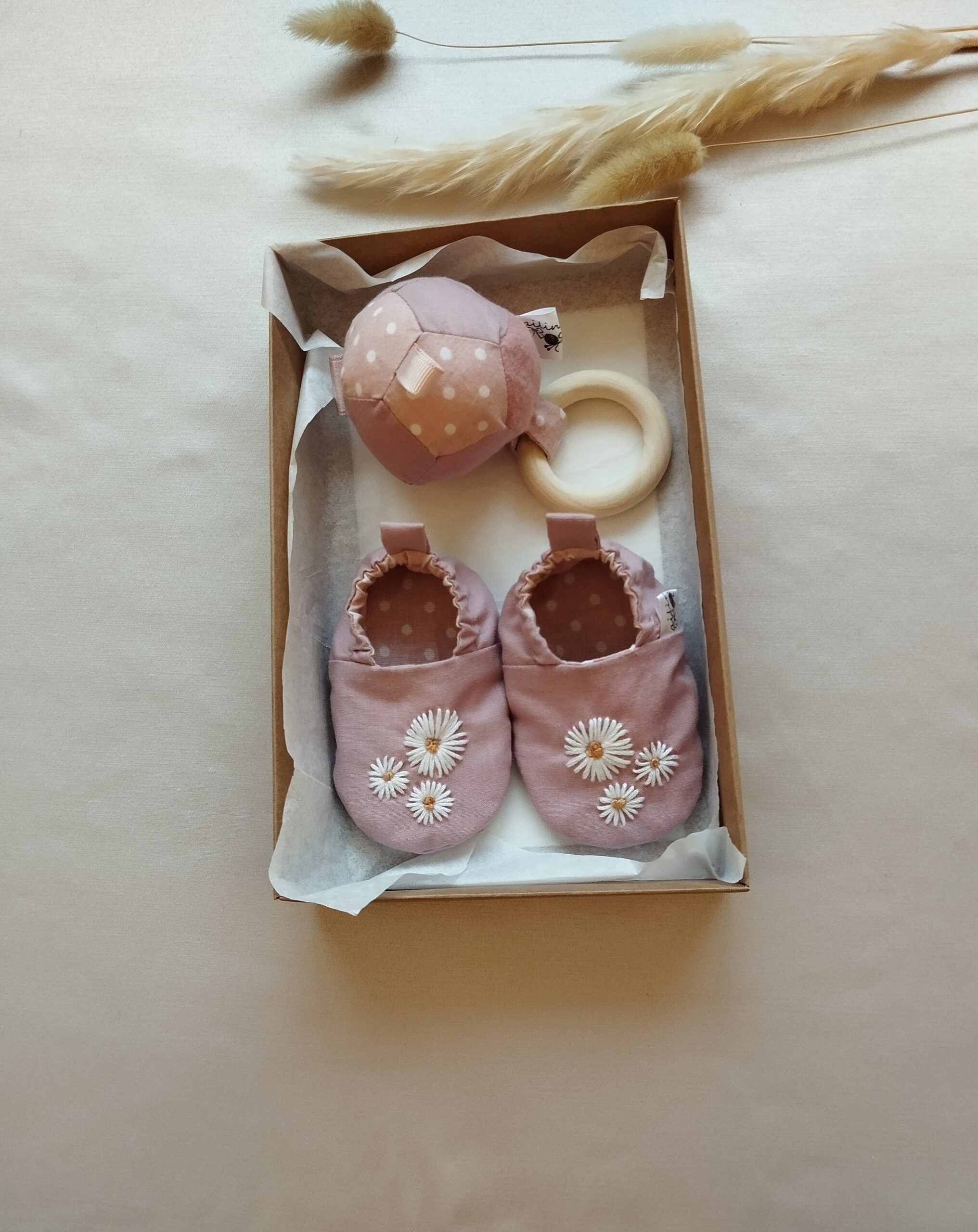 Rankomis siūti batukai su kruopščiai siuvinėtomis gėlyčių detalėmis ir minkštas kamuoliukas barškutis skatinantis mažylių smalsumą ir naujus pojūčius. Barškutis ne tik minkštas, bet ir su įvairių spalvų ir audinio tekstūros skirtumais, leidžainčiais mažyliui jausti skirtingus švelnumo pojūčius.